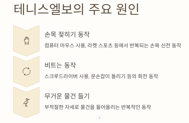 테니스엘보의 가장 큰 원인은 팔꿈치 바깥쪽에 붙은 힘줄을 과도하게 사용하는 데 있습니다. 손목을 젖히거나 비트는 동작을 반복하다 보면 힘줄에 작은 손상이 계속 쌓이고 결국 염증과 통증으로 이어집니다. 그래서 무거운 물건을 들거나 악수, 문손잡이를 돌리는 단순한 일상 동작에서도 통증이 나타날 수 있습니다.